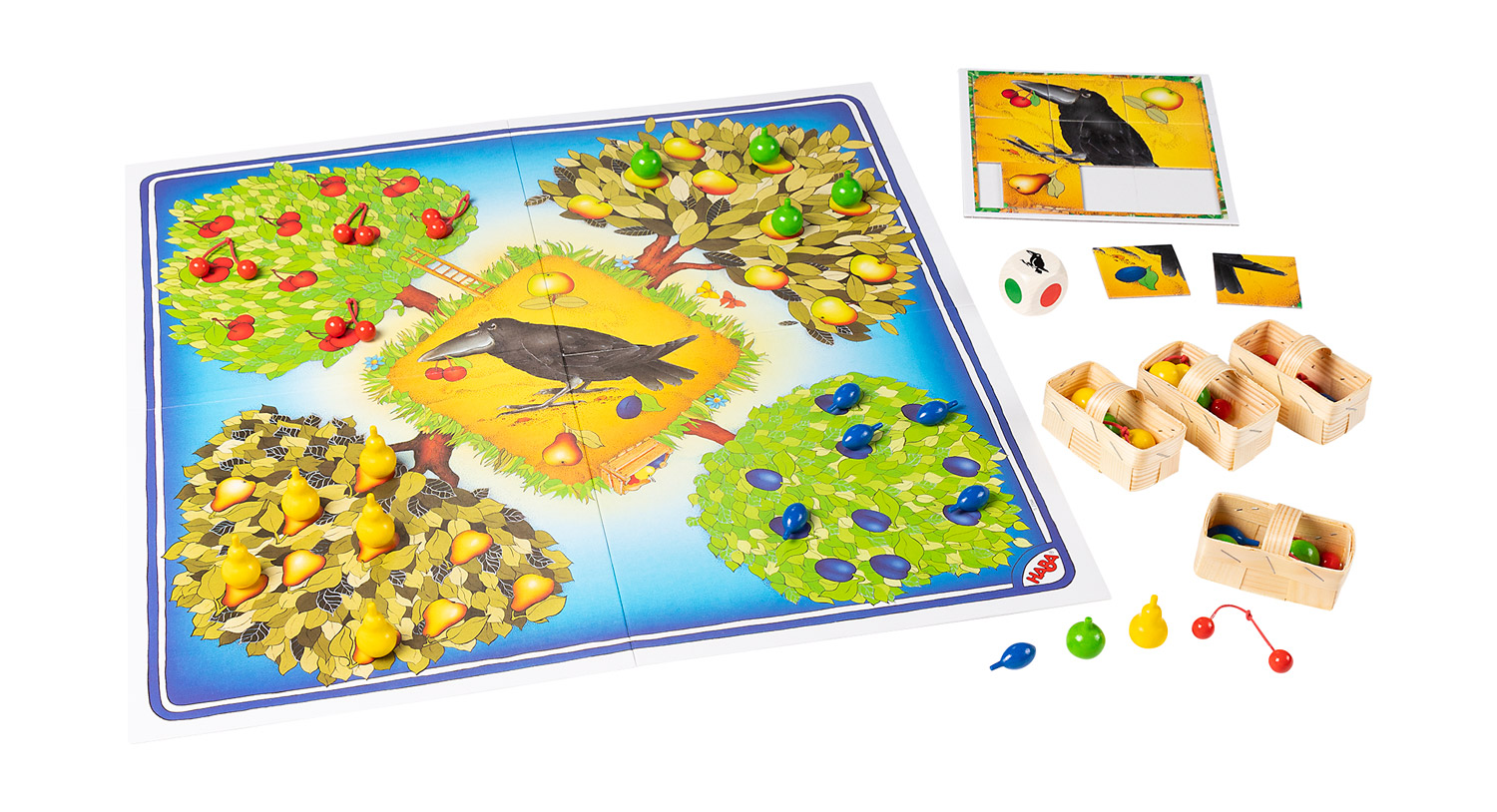 Ein spannendes Gemeinschaftsspiel, bei dem es gilt, die mit Kirschen, Äpfeln, Birnen und Pflaumen vollhängenden Bäume abzuernten, bevor der freche Rabe zuschlägt.
