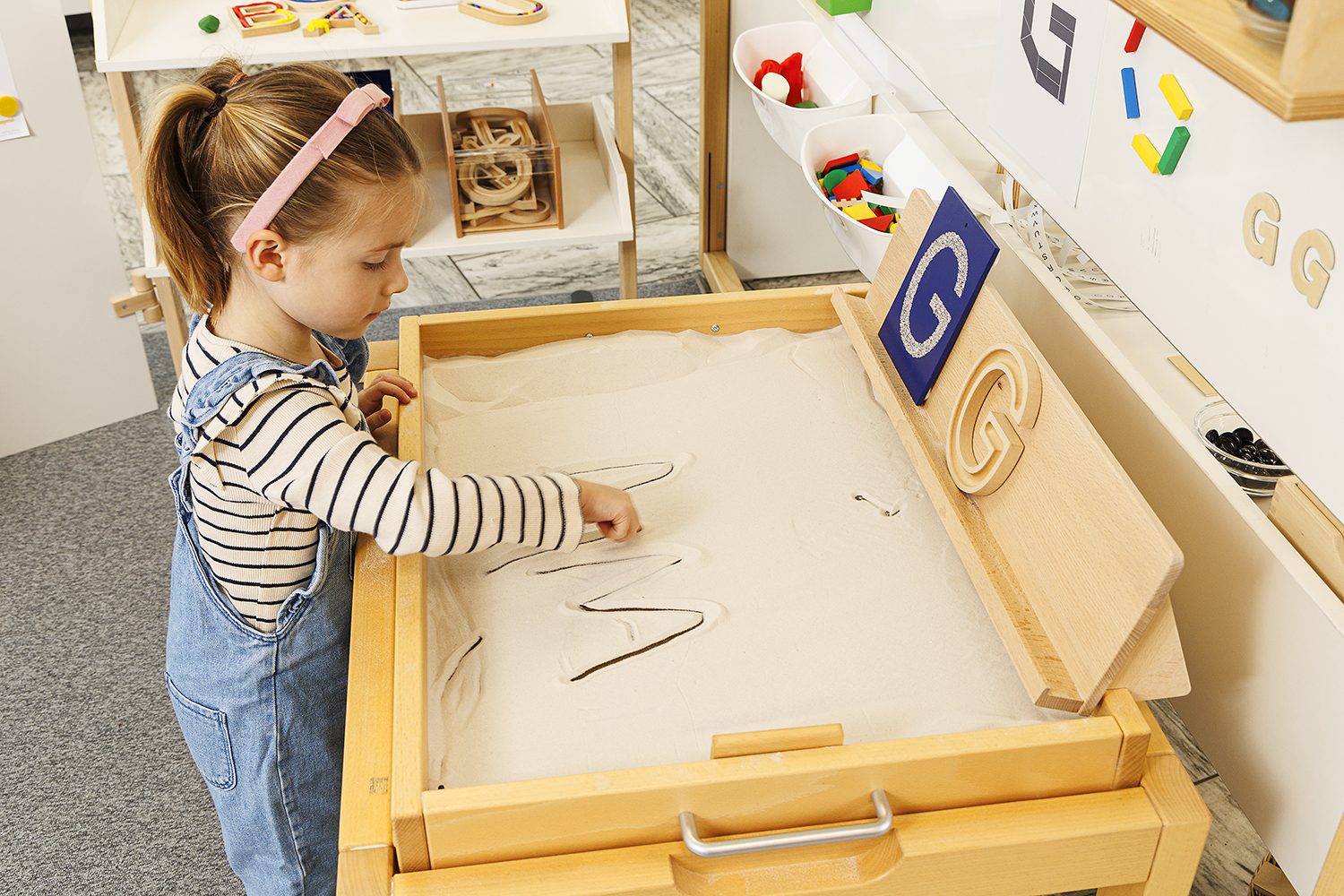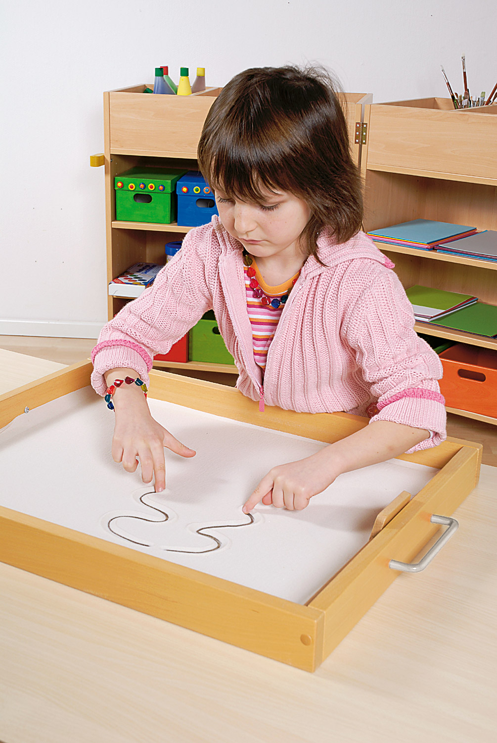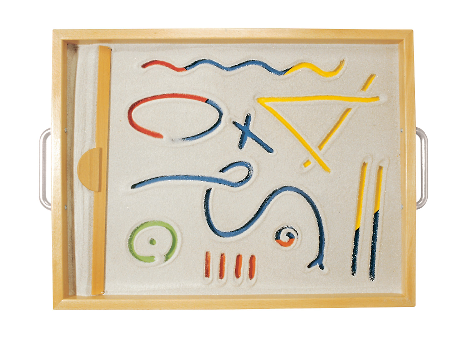 Fesselndes Spiel mit dem vielseitigen Naturmaterial Sand. Sandspiele können nicht nur draußen, sondern auch im Gruppenraum durchgeführt werden. Kinder greifen gerne in den feinen Sand, der so angenehm zwischen den Fingern rieselt. Die Finger können, einzeln oder alle zusammen, Löcher bohren oder Figuren in den Sand zeichnen. Das Besondere an dieser Sandwanne ist der Glasboden. Farbiges Papier oder selbstgestaltete Bilder können unter den Glasboden geschoben werden. Durch Spurenziehen mit Fingern, Rechen oder Stöcken wird der farbige Untergrund sichtbar. Es entstehen wunderschöne Muster und Bilder, die aber von den Kindern jederzeit durch den Sandschieber wieder gelöscht werden können, um neue Ideen zu verwirklichen. Damit der Sand nicht überall im Gruppenraum verstreut wird, empfehlen wir, die Sandwanne auf ein großes Tuch zu stellen. Dieses lässt sich dann nach dem Spiel bequem ausschütteln.
