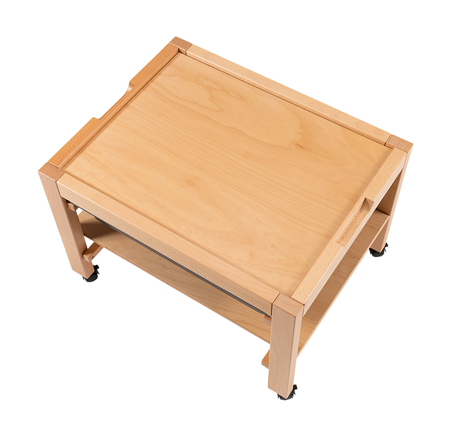 Unsere große Sandwanne und alle Zubehörteile und -sets sind darin ideal untergebracht. Die Schublade aus Kunststoff lässt sich zu beiden Seiten herausziehen (arretiert).